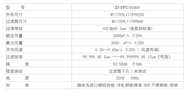 ZJ-FFU-EC400型號FFU工作時間長,低噪聲,免維護,震動小,可無級調速,風速均勻,安裝方便等。